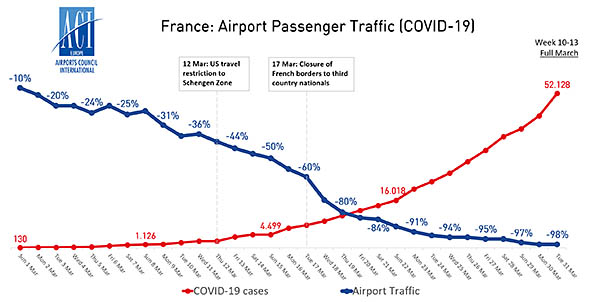 « Cela ne ressemble à rien de ce que nous avons vu auparavant », souligne dans un communiqué le directeur général d’ACI Europe Olivier Jankovec ; « lors de la crise financière de 2008, il a fallu douze mois aux aéroports européens pour perdre 100 millions de passagers. Avec le Covid-19, il n’a fallu que 31 jours ». Il ajoute que les vols de rapatriement ramenant les Européens dans leur pays d’origine « prenant fin, ce qui reste maintenant se limite essentiellement au trafic de fret, ainsi qu’aux services aériens sanitaires et autres services aériens d’urgence ».