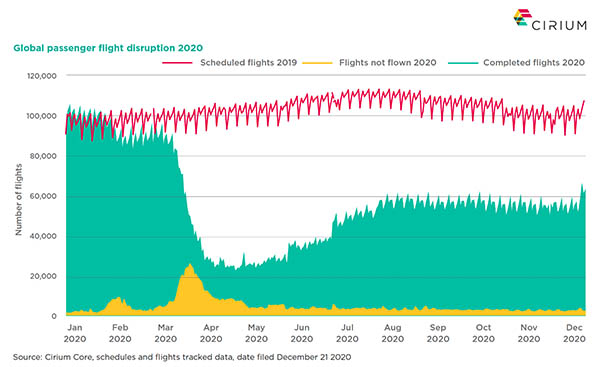 Au plus fort des perturbations au printemps, les vols passagers réguliers ont chuté à seulement 13.600 dans le monde le 25 avril, à comparer à la journée la plus chargée le 3 janvier quand, Cirium a suivi plus de 95.000 vols passagers réguliers dans le monde. Soit une « réduction extraordinaire » de 86% du nombre de vols. De janvier à décembre, les compagnies aériennes ont effectué 49% de vols en moins par rapport à 2019, soit une baisse de 33,2 millions à seulement 16,8 millions de vols (au 20 décembre).