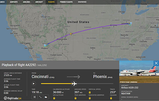 Le vol AA2292 du 21 février 2021 avait quitté Cincinnati pour l’aéroport de Phoenix, et l’Airbus A320 de la compagnie américaine survolait à 37.000 pieds le nord-ouest du Nouveau-Mexique quand l’équipage à contacté le centre de contrôle aérien d’Albuquerque pour signaler un incident.