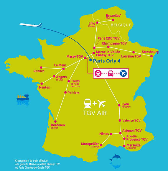 - Entre Paris-Orly (via la gare de Massy TGV) et Valence TGV, Avignon TGV et Marseille Saint-Charles.