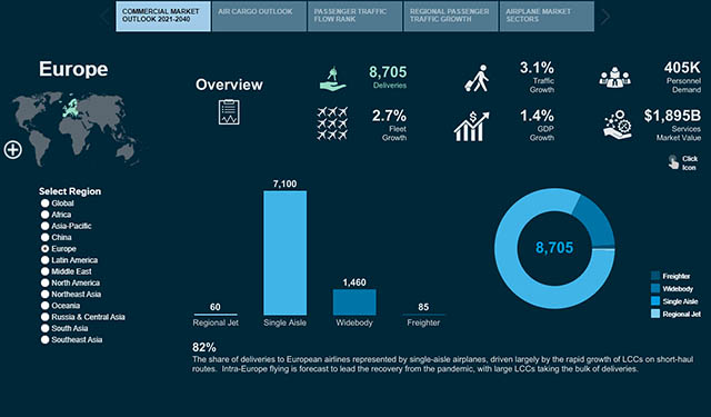 Le marché du transport aérien « se redresse de façon importante, tant aux niveaux mondial et régional » comme Boeing l’avait annoncé l’année dernière. La demande de voyages aériens en Europe est « à la pointe de cette reprise » en raison notamment de l’assouplissement des restrictions sanitaires et de déplacements liées à la pandémie de Covid-19. Les vols long-courriers devraient recouvrer leur niveau pré-pandémie d’ici 2023 à 2024.
