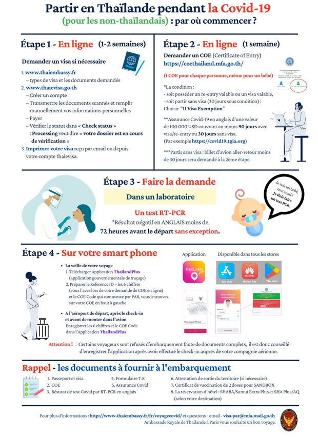 Ayant fermé ses frontières depuis le début de la pandémie de Covid-19 en mars 2020, la Thaïlande cherche à relancer son industrie touristique. Malgré certains assouplissements, les conditions pour s’y rendre sont tellement contraignantes (réservation d’hôtel, assurance maladie à hauteur de 100 000 dollars, un test PCR avant le vol et encore deux autres sur place même pour les vaccinés, application de suivi à installer sur son smartphone, etc.) que seulement 33 000 étrangers sont arrivés à Phuket entre le 1er juillet et le 15 septembre 2021. L’ambassade de Thaïlande à Paris résume dans une infographie la démarche à suivre -un véritable parcours du combattant :