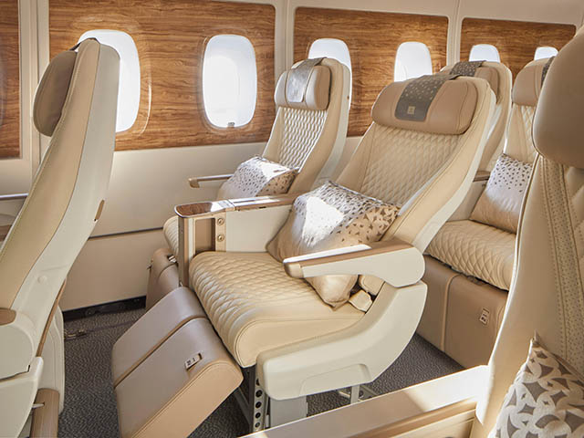 Sur le Boeing 777 d’Emirates, 5 rangées de sièges de classe Éco situées juste derrière la classe Affaires seront supprimées pour installer 24 sièges Premium, disposés là aussi en 2+4+2. La cabine Premium devrait en outre être disponible de base dans certains 777X et dans les futurs A350 et 787.