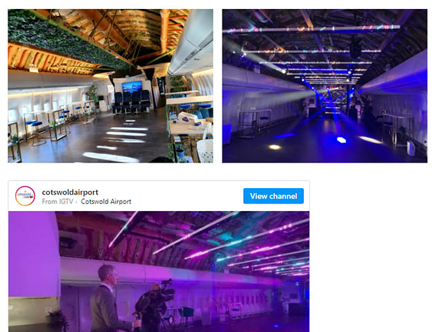 Cotswold a dépensé 500.000 £ pour convertir l’avion en espace événementiel, dont selon la CEO Suzannah Harvey 150.000 pour le système d’éclairage et de son, 80.000 pour refaire le câblage ou 30.000 pour les escaliers… L’aéroport vient de publier les premières photos et vidéos « d’ambiance » avec néons, projecteurs et tout ce qu’il faut pour réussir par exemple une soirée de mariage ; ceux qui ne sont pas sur Instaram pourront voir le résultat par exemple sur le site de Sam Chui.