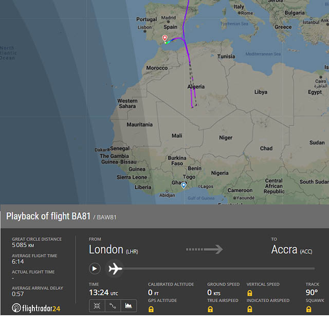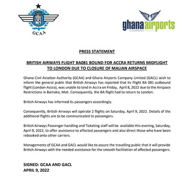 Le 8 avril 2022, le vol BA81 de la compagnie nationale britannique entre sa base à Londres-Heathrow et l’aéroport d’Accra-Kotoka était parti comme prévu, le Boeing 777-200ER avec environ 200 passagers à bord devant arriver au Ghana à 19h35. Mais le survol du Mali lui a été refusé, et faute de carburant pour un contournement du pays l’avion a fait demi-tour et s’est posé à Malaga. Une fois son ravitaillement terminé, l’appareil a fait son retour à Londres en milieu de soirée.