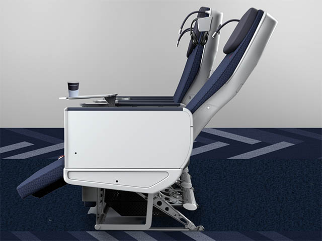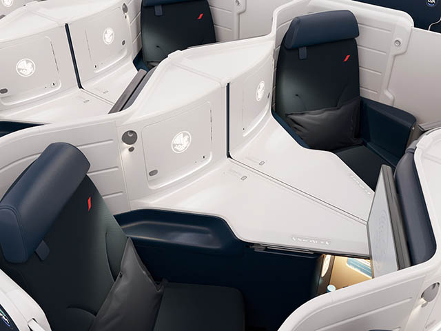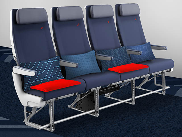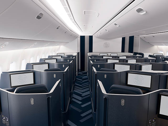 L’ensemble des cabines « déclinent avec élégance les couleurs identitaires de la marque : bleu marine, blanc apportant lumière et contraste, touches de rouge ». Air France précise que le premier 777-300ER réaménagé (F-GZNK baptisé Fontainebleau) sera initialement déployé à l’automne entre sa base à Paris-CDG et l’aéroport de New York-JFK, aux côtés de ses frères équipés de La Première. Il est aujourd’hui configuré en 42+24+315 (381 sièges, 12 de plus) ; le changement profite donc bien aux classes premium.