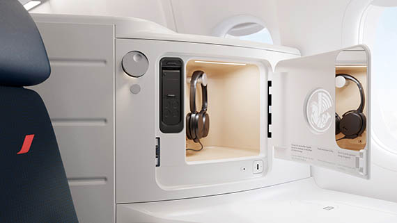 En s’installant à bord de cette nouvelle classe Affaires, chacun est « accueilli par un hippocampe ailé rétroéclairé, incarnant le mythe fondateur de la compagnie et la richesse de son histoire ». À l’intérieur du siège, le capitonnage apporte « une sensation de moelleux et d’intimité » : laine, aluminium brossé, cuir pleine fleur français, Air France a privilégié des matières nobles, douces et naturelles pour sa confection. Enfin, chaque fauteuil est brodé de l’accent rouge, symbole de marque de la compagnie.
