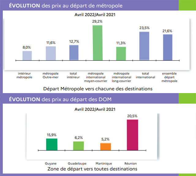 Au départ de métropole sur le réseau intérieur, les prix sont en augmentation de 8,0% (0,1% au cumul) pour les liaisons intra-métropolitaines, et de 11,6% (10,6% au cumul) sur le faisceau Métropole-Outre-mer. La hausse est plus marquée sur le réseau international (+23,5% entre avril 2021 et avril 2022, et +10,4 % au cumul sur les quatre premiers mois de l’année). L’augmentation est tirée par le réseau international moyen-courrier, pour lequel la hausse enregistrée est de 29,2% (+8,4% au cumul) ; les transporteurs à bas-coûts « alimentent tout particulièrement cette évolution ». Le réseau international long-courrier subit une hausse moins forte, de 11,3% (+8,8 % au cumul), « avec de fortes disparités selon les faisceaux » : les hausses sont de faible amplitude à destination de l’Amérique du Nord a contrario de celles observées pour les vols vers l’Asie/ Pacifique (dont certaines destinations sont par ailleurs impactés par la guerre avec des temps de vols plus longs) ou l’Amérique latine.