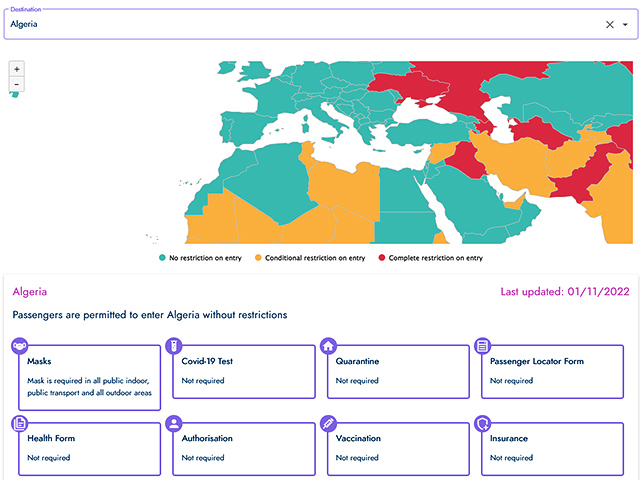 Selon le site Traveldoc utilisé entre autres par les compagnies du groupe Air France, la seule mesure sanitaire à respecter encore en Algérie est le port du masque, en intérieur comme en extérieur et particulièrement dans les transports en commun.