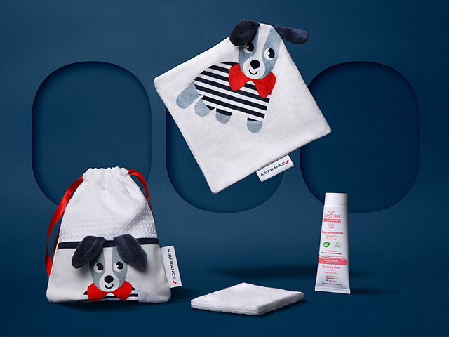 Air France propose également de nouvelles attentions aux familles voyageant avec un bébé (de 0 à 2 ans). Dans toutes les cabines long-courriers, les clients reçoivent une jolie boîte en papier kraft contenant un doudou « petit chien » confectionné dans des matériaux recyclables, doux et réutilisables. En cabines La Première, Business et Premium Economy, ce kit est complété par un joli pochon aux couleurs d’Air France et une eau thermale Castéra certifiée BIO et fabriquée en France.