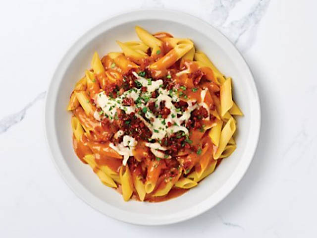 pennes en sauce rosée, parsemées de fromage mozzarella, de tomates séchées et de persil.