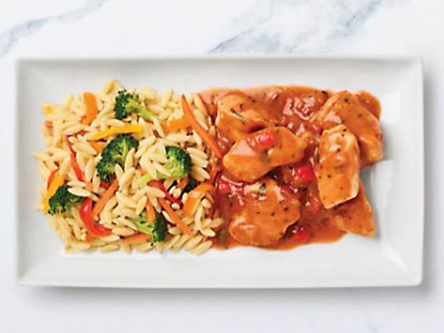 poulet à la provençale, servi avec orzo au brocoli et aux carottes,
