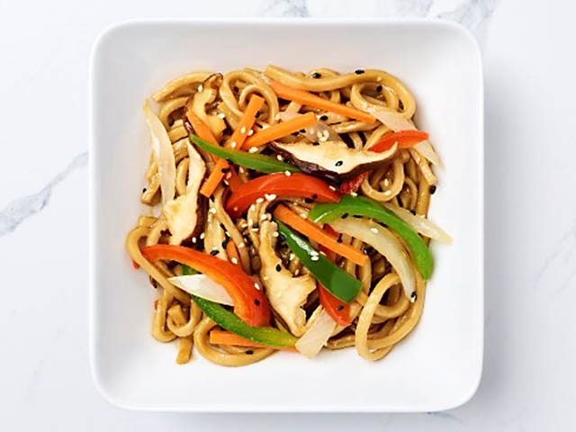 nouilles Shanghai, sautées aux légumes dans une sauce asiatique.