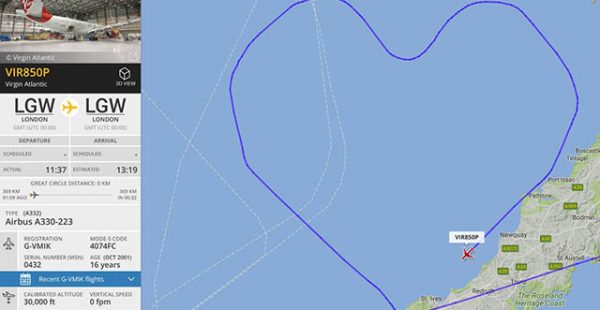 Après le sapin de Noël d’Airbus et l’avion de Boeing, la compagnie britannique a à son tour choisi d’utiliser un vol d’entrainement pour faire des dessins dans le ciel. En l’occurrence un cœur, logique en ce jour de la Saint Valentin le 14 février 2018. Muni d’une autorisation spéciale du contrôle aérien, l’Airbus A330-200 effectuant le vol VIR850P a décollé de l’aéroport de Londres-Gatwick à 11h37 direction l’ouest, avant de dessiner un cœur dans le ciel au large de Newquay et de revenir à son point de départ moins de deux heures plus tard.