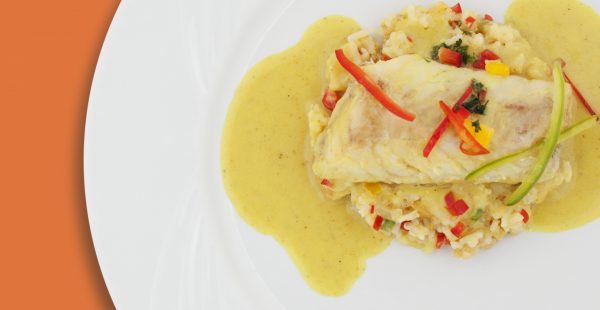 – Dos de cabillaud mariné au citron vert, sauce crème safran du pays, risotto de banane plantain à déguster en Mars 2018 – Juin 2018 – Septembre 2018 – Décembre 2018