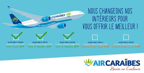 La compagnie française basée à l’aéroport de Paris-Orly a annoncé le 29 mars 2018 que les deux A330-200 de sa flotte seront réaménagés d’ici la fin juin, après les trois A330-300 ayant subi le même traitement l’année dernière (elle détient également un A330-200 dit de spare, engagé selon les besoins d’exploitation pour pallier notamment une panne avion sur le reste de la flotte). Air Caraïbes disposera alors d’une flotte transatlantique « à la pointe de la modernité », composée de deux A350-900 neufs et de cinq A330 entièrement rénovés, qui permettra d’offrir à l’ensemble de ses passagers « l’un des plus hauts niveaux de confort disponibles sur les vols entre Paris et les Caraïbes ».