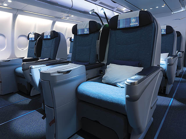 Air Caraïbes a fait le choix des deux sociétés françaises Sabena Technics et Stélia pour fournir et installer les sièges de la classe Affaires Madras. L’espacement entre les sièges sera de 155 cm. Les écrans de divertissements de 38 cm sont désormais tactiles, et les passagers disposeront également de télécommandes.