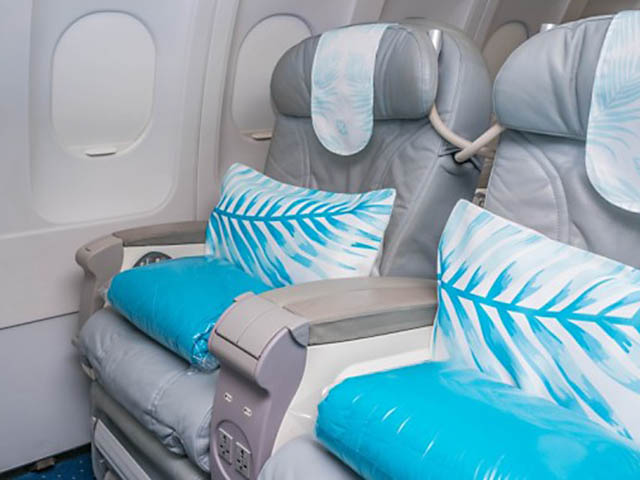 La compagnie nationale seychelloise basée dans l’île de Mahé a dévoilé le 30 mai 2018 une gamme de nouveaux produits dans les cabines Economy et Business Class, qui seront disponibles à compter de demain. Les produits de bord « remaniés aux couleurs bleu, blanc et rouge » de la livrée Air Seychelles et « inspirés par la flore et la faune uniques » de l’archipel de l’Océan Indien ont été fabriqués par Shanghai Haoliwen Airline Appliance, société spécialisée « dans la production de couvertures modernes haut de gamme et des serviettes ». Pour une nuit de sommeil confortable en classe Affaires, Air Seychelles a introduit des duvets souples élégants réversibles dans un satin de pêche bleu ciel, avec des surpiqûres reflétant la forme du logo de la compagnie aérienne d’un côté et une élégante finition micro peluche bleu ciel sur le revers. Le revêtement cabine, y compris les housses et les taies d’appuie-tête ornés d’une feuille de palmier dans différentes nuances de bleu sur un fond crème, reflétant la palette de couleurs d’Air Seychelles, « complète l’expérience à bord » en classe Affaires. En classe Economie sur certains vols, une nouvelle couverture « rouge jazzy » en polaire douce et légère apporte « une atmosphère vibrante dans la cabine, assurant que les clients arrivent bien reposés à leur destination finale ».