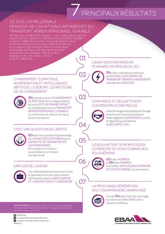 L’enquête intitulée « Élargir nos horizons : la vision des millénials concernant le futur de l’aviation d’affaires » (Expanding Horizons: How Millennials see the Future of Business Aviation), a été élaborée en coopération avec ThinkYoung et publiée au Salon européen de l’aviation d’affaires 2018 (EBACE2018) à Genève. Dans le cadre de cette étude, des millénials (des jeunes de 18 à 25 ans) issus de quatre principaux pays européens, l’Allemagne, la France, le Royaume-Uni et la Suisse, ont été interrogés sur la mobilité, l’aviation d’affaires et l’avenir du transport aérien personnel durable.