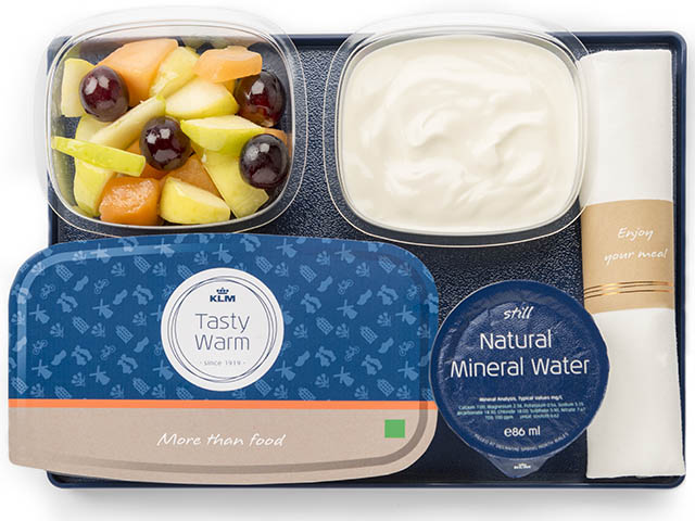 Le nouveau concept de classe Economie intercontinentale a également été conçu en tenant compte du développement durable : les nouveaux plateaux et couverts sont plus légers qu’avant, ce qui contribue à réduire les émissions de CO2. En outre, le set de table en papier sur le plateau a été retiré, ce qui signifie que des millions de feuilles de papier de moins sont nécessaires chaque année. KLM rappelle qu’elle veille à ce que sa restauration en vol soit aussi durable que possible. Sur tous les vols, du chocolat et du café certifiés UTZ ou Fairtrade sont servis. Sur tous les vols au départ d’Amsterdam, KLM sert exclusivement des produits à base de volaille et d’œufs certifiés et produits dans le respect des animaux. Pour ces efforts, KLM a remporté le Good Egg Award et le Good Chicken Award. « Dans la mesure du possible », cette restauration durable est également assurée sur les vols vers Amsterdam.