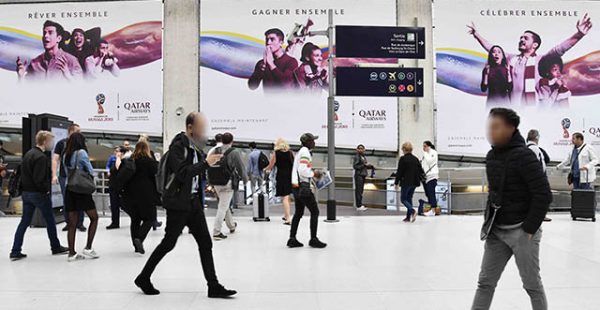 Qatar Airways est également présente à la gare du Nord à Paris grâce à une campagne d’affichage d’ampleur permettant à la compagnie de cibler une population active. La campagne débutée dès le 18 juin s’étendra jusqu’au 3 juillet, touchant ainsi plus de 3 millions de passagers sur deux semaines. Sur l’ensemble de la période du Mondial, la « Meilleure compagnie aérienne du monde » diffusera 68 spots publicitaires de 30 et 60 secondes sur la chaîne TV BeIn Sports. Un spot sera diffusé à chacun des matchs de pool du 14 au 28 juin dont les trois matchs de l’équipe de France.
