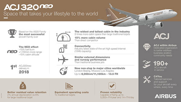 Airbus met en avant dans la famille ACJ320neo une cabine « plus large et plus grande que celle des avions d’affaires traditionnels », tout en ayant « une empreinte de rampe et des coûts d’exploitation similaires, et une meilleure valeur résiduelle ». Les différences par rapport à la famille destinée aux compagnies aériennes incluent une soute renforcée pour transporter des réservoirs centraux supplémentaires (ACT) afin de permettre une portée intercontinentale, des escaliers intégrés pour être autonome dans les aéroports, et une pressurisation de la cabine inférieure pour le confort des passagers. Les commandes de la famille ACJ320neo totalisent à ce jour neuf appareils, dont trois ACJ319neo et six ACJ320neo.