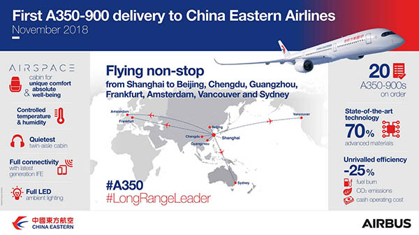 Lors de sa commande en 2016, China Eastern Airlines avait déjà spécifié le rythme des livraisons attendues : deux en 2018, trois autres en 2019, deux en 2020 et les treize derniers entre 2021 et 2022. Elle rejoint en Chine les opérateurs de la famille A350XWB que sont déjà Cathay Pacific, Hainan Airlines, Hong Kong Airlines, Sichuan Airlines (dont China Southern est actionnaire) et Air China. D’ici deux ans, la compagnie de l’alliance SkyTeam doit aussi mettre en service trois autres types d’avions de dernière génération : l’A320neo (70 commandés) et le 737 MAX 8 (57 commandés), et le 787-9 Dreamliner. Seule la date de livraison des vingt Comac C919 attendus n’a toujours pas été précisée.