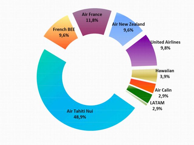 Au niveau des transporteurs, Air Tahiti Nui occupe la moitié des part du trafic international, avec 49% des passagers internationaux transportés, soit deux points de plus que lors des deux derniers mois de 2018. Loin derrière se regroupent les autres autres opérateurs desquels se détache légèrement Air France avec 11,8%, suivi de trois compagnies qui se tiennent dans un mouchoir de poche avec United Airlines (9,8%), Air New Zealand et la low cost French bee (9,6% chacun).