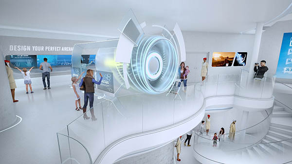 L’intérieur du pavillon Emirates fera appel à des technologies qui permettent à la lumière naturelle d’entrer dans l’espace, réduisant ainsi la consommation d’énergie. Le cœur du pavillon sera dédié au parcours expérientiel des visiteurs. Le deuxième étage du pavillon Emirates abritera l’auditorium pour les conférenciers et les événements de l’industrie, tandis que le troisième étage sera constitué un jardin ouvert pour que les visiteurs puissent profiter du cadre naturel et des espaces verts. Le pavillon Emirates permettra de découvrir, par des expériences ludiques, les différentes facettes du futur de l’aviation, des sciences du vol à l’expérience des passagers dans les aéroports en passant par les progrès de la technologie des matériaux et l’amélioration du confort en cabine. Les visiteurs pourront apprendre les principes de base de l’aviation et comprendre les théories scientifiques du vol. Ils pourront également se plonger dans l’avenir de la conception des cabines d’avion avec des innovations toujours plus surprenantes pour améliorer le confort et le bien-être des passagers.