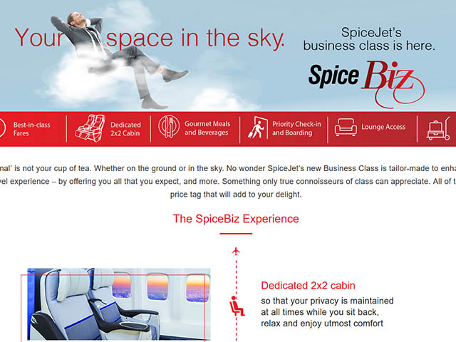 La classe SpiceBiz de la spécialiste indienne du vol pas cher offre des rangées de deux sièges dans des Boeing 737-800 récupérés chez sa rivale, ainsi que des menus « gourmet », un accès aux salons d’aéroport, une franchise bagage plus élevée et bien sûr l’enregistrement et l’embarquement prioritaires. SpiceJet a ouvert les réservations de cette nouvelle cabine le 11 mai 2019, sur un réseau limité pour l’instant à des routes reliant les villes principales de l’Inde comme Delhi, Mumbai, Kolkata, Hyderabad ou Bangalore. L’aménagement variera selon les 22 avions pris en leasing, avec 8 sièges en 737-700, 12 en 737-800 et 28 en 737-900.