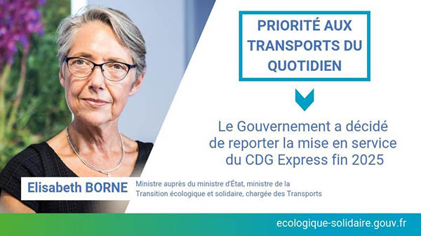 La ministre des Transports Elisabeth Borne a confirmé hier le report à fin 2025 de la mise en service du CDG Express, une liaison spécifique du RER B devant être mise en place pendant les Jeux Olympiques de Paris.