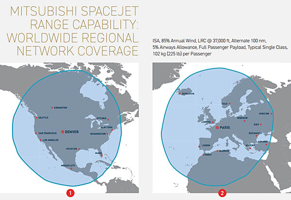 « Issue d’une étude de concept pour le MRJ70 aujourd’hui retiré », le SpaceJet M100 est selon son concepteur « parfaitement adapté aux marchés américain et mondial ». Sur le marché américain, l’avion est optimisé pour être conforme à la scope clause, dans la configuration de cabine à trois classes pouvant accueillir 65 à 76 personnes. Il peut également être configuré de manière flexible pour répondre aux autres besoins du marché mondial, jusqu’à 88 sièges en classe unique, avec une économie de fonctionnement à la pointe de l’industrie dans l’ensemble des configurations.
