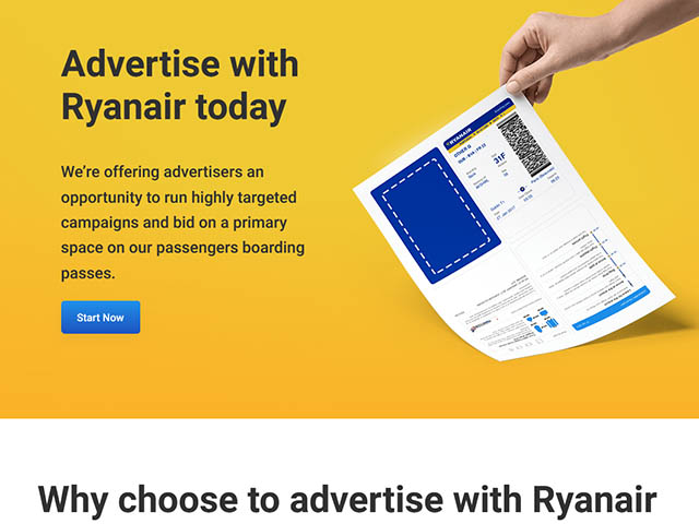 Depuis le 18 juin 2019, la spécialiste irlandaise du vol pas cher met un nouvel espace publicitaire à disposition des annonceurs : sa carte d’embarquement. « Avec ses faibles niveaux de dépense minimum et son portail en libre-service unique en ligne », ce produit permet « aux grandes marques globales et aux marques locales » d’atteindre directement la clientèle de Ryanair, desservant plus de 200 destinations dans 37 pays différents.