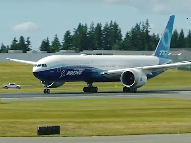 Boeing a mis en ligne samedi une vidéo du 777-9 effectuant des essais de roulage à basse vitesse à Everett, soulignant que c’est la première fois que l’appareil se déplace par ses propres moyens. Les extrémités des ailes ont été à nouveau dépliées puis repliées lors des tests ; rappelons qu’elles seront en position haute au sol pour respecter les normes aéroportuaires du 777, et déployées en vol pour améliorer un peu la portance. « Il s’agit d’un des multiples tests qui seront menés avant que le 777X décolle plus tard cette année », explique Boeing. GE Aviation a confirmé lors du Salon du Bourget le report du vol inaugural espéré en juin, probablement à la fin 2019 : son CEO David Joyce a expliqué que le motoriste avait constaté l’usure prématurée d’un stator situé à l’avant du compresseur du GE9X, à l’issue d’un essai d’endurance.