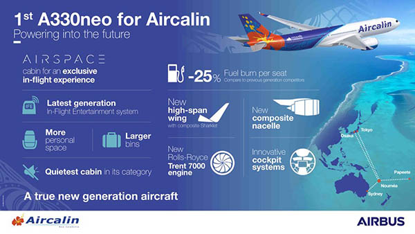 Ces A330neo renforceront selon Airbus « la capacité et la connectivité sans escale entre la Nouvelle-Calédonie et les marchés du Japon, de l’Australie et des îles du Pacifique, tout en permettant une réduction de 25% de la consommation de carburant par siège (par rapport aux appareils concurrents de la génération précédente) et en offrant aux passagers les niveaux de confort les plus modernes en cabine. Ces liaisons sont essentielles pour le tourisme ainsi que les voyages d’affaires, qui sont déterminants pour le développement économique de la Nouvelle-Calédonie ».