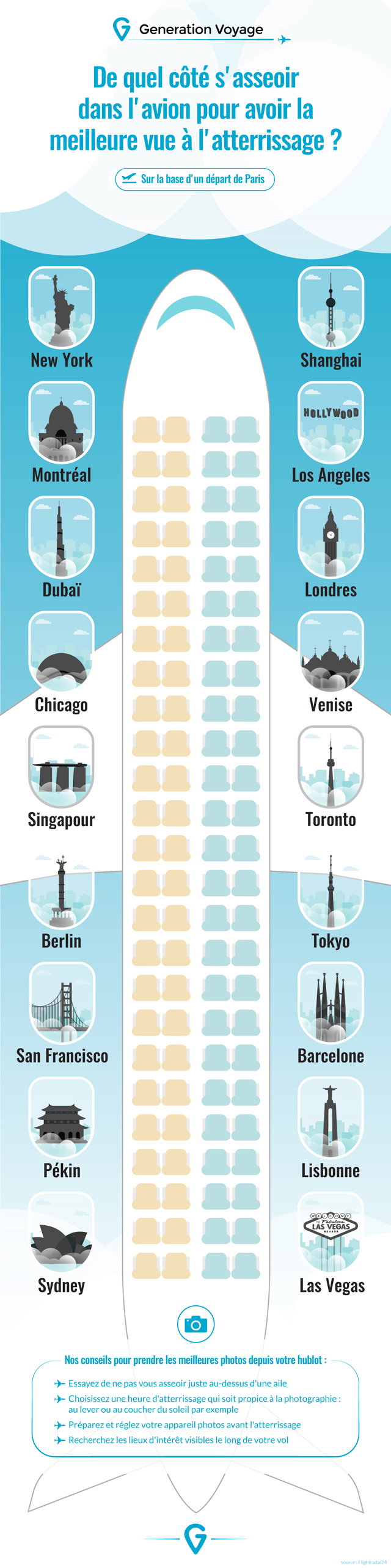 Le guide de voyage en ligne Generation Voyage a réalisé une infographie permettant de savoir de quel côté de l’appareil il faut se trouver pour profiter d’un atterrissage avec la meilleure vue sur 18 villes dans le monde. Les informations sont basées sur un vol au départ de Paris en s’appuyant sur les données du site FlightRadar24, qui affiche des informations en temps réel sur le vol d’avions commerciaux.