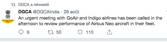 L’appel concernerait les récentes pannes de moteur de l’Airbus A320neo de ces compagnies aériennes, propulsé par des turboréacteurs américains Pratt et Whitney PW1000G. « Une réunion urgente avec GoAir et IndiGo Airlines a été convoquée pour examiner les performances d’Airbus A320neos dans leurs flottes », a déclaré la DGAC dans un message Twitter le 28 août.