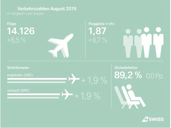 La compagnie SWISS (Swiss International Air Lines) a transporté 1 871 704 passagers en août 2019, chiffre en hausse de 6,7 % en comparaison annuelle.