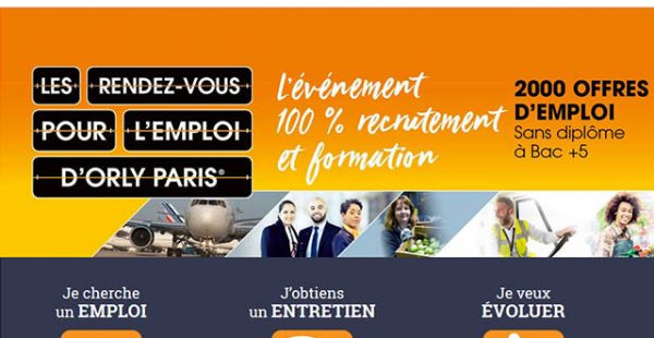 Jeudi 17 octobre 2019, le Terminal 4 de l’aéroport de Paris-Orly accueillera la huitième édition de ses rendez-vous pour l’emploi, avec à l’affiche 2000 offres d’emploi « tous secteurs, de sans diplôme à Bac +5, débutant ou confirmé », dans la plateforme comme dans les départements voisins. Le site annonce 700 entretiens en « job meeting », la découverte de « nombreuses offres de formation et de financement, des métiers qui recrutent, des évaluations et des tests de langues », ainsi que 30 ateliers et conférences. 60 entreprises et 150 recruteurs sont annoncés, regroupés en village thématiques dont celui concernant l’aéroportuaire, l’aérien et l’aéronautique. Des postes administratifs et dans la logistique, le commerce, l’hôtellerie et la restauration mais aussi l’agroalimentaire ou les assurances sont mis en avant.