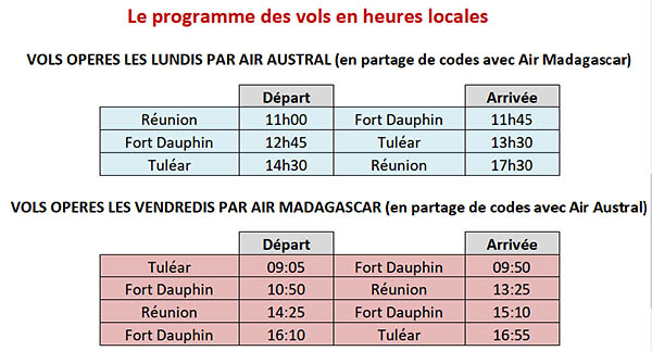 Le 3 décembre 2018, Air Austral et son partenaire Air Madagascar inauguraient leur premier vol entre Fort Dauphin, Tuléar et Saint-Denis de La Réunion, « une étape importante pour les 2 compagnies aériennes dans la concrétisation de leur partenariat stratégique ». Un an plus tard, les partenaires « enregistrent de bons résultats, la liaison est installée et en progression » selon leur communiqué d’hier. La ligne est opérée conjointement au moyen des Boeing 737-800 des deux compagnies et ce, à raison de deux fréquences par semaine : le lundi par Air Austral, et le vendredi par Air Madagascar, l’ensemble des vols « ayant vocation à être commercialisé par les deux compagnies en partage de codes ». Le billet aller-retour entre La Réunion, Fort Dauphin et Tuléar est proposé à partir de 299€ TTC (Tarifs TTC aller-retour en classe LOISIRS (classe économique) soumis à conditions, sous réserve de disponibilité), tandis qu’au départ de Métropole, la desserte de Tuléar ou Fort Dauphin est actuellement disponible à partir de 698€ TTC l’aller-retour depuis Paris-CDG et à partir de 798€ TTC l’aller-retour depuis Marseille (Tarifs LIGHT aller-retour TTC en classe LOISIRS (économique) soumis à conditions, sous réserve de disponibilité, pour toute réservation avant le 15 décembre 2019 pour des vols en basse saison. Tarifs sans bagage en soute).