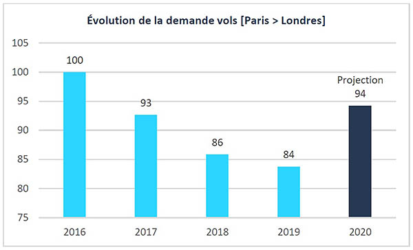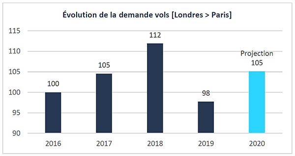 (Évolution des recherches effectuées sur Algofly entre le 1er janvier 2015 et le 31 janvier 2020 pour des vols A/R Londres-Paris effectués de 2016 à 2020. Indice base 100 en 2016. La demande de 2020 est une projection annuelle issue des tarifs relevés entre le 1er et le 8 février 2020 pour des vols Londres-Paris sur toute l’année 2020 couplés à des indices de conjoncture et d’historique de variation de prix).