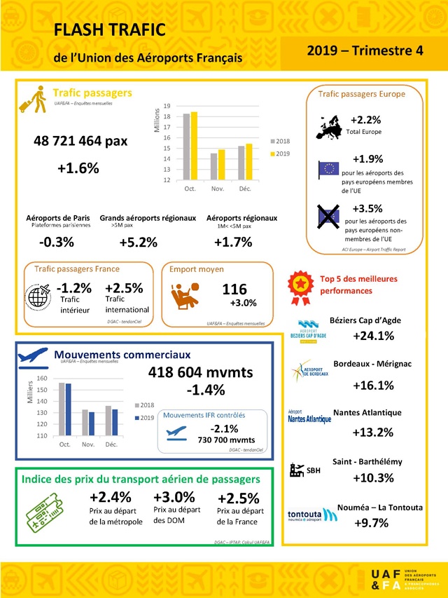 Au quatrième trimestre 2019, le nombre de passagers commerciaux dans les aéroports français est en augmentation avec toutefois un petit ralentissement de la croissance, +1.6% par rapport au quatrième trimestre 2018, selon le rapport trimestriel de l’Union des Aéroports Français (UAF).
