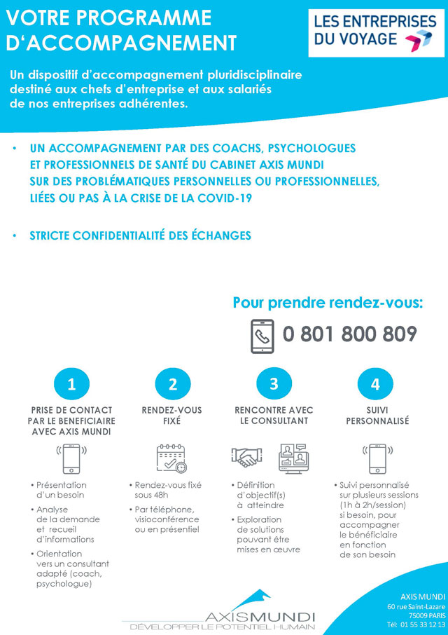 En partenariat avec Axis Mundi, spécialiste de l’aide aux organisations dans leurs ressources humaines, EdV propose à ses adhérents une offre d’accompagnement par des coachs, psychologues et professionnels de santé sur des problématiques personnelles et professionnelles, consécutives à la crise de la COVID 19. Chaque adhérent chef d’entreprise et ses salariés pourront faire appel aux services d’Axis Mundi (prise de rendez-vous en appelant au 08.01.80.08.09) dans la plus stricte confidentialité. Cet accompagnement est à la charge des EdV.