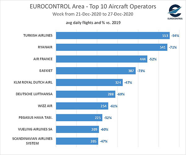 Selon Eurocontrol, la pandémie de Covid-19 a déjà « couté » à l’Europe plus de 6 millions de vols en 2020, et les choses ne semblent pas s’arranger. Durant la semaine du 21 au 27 décembre, pour un trafic global ayant reculé de 56% par rapport à Noël 2019, Turkish Airlines était le transporteur le plus actif avec 553 vols quotidiens en moyenne (-54%), juste devant la low cost Ryanair (541 vols, -71%). Air France venait ensuite avec 441 décollages (-52%), puis easyJet avec 387 (-73%) et KLM Royal Dutch Airlines avec 324 (-47%).