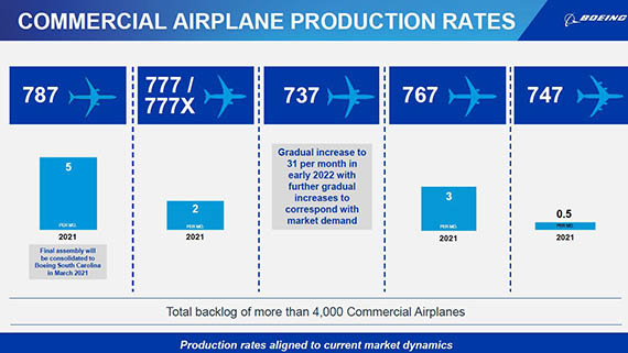 Pour cette année justement, Boeing a dévoilé ses plans de production pour l’ensemble de ses avions commerciaux : les FAL à Everett et North Charleston produiront chaque mois « progressivement jusqu’à 31 737 » civils et militaires, trois 767 (fret et militaires), « 0,5 » 747 (un tous les deux mois donc), cinq 787 Dreamliner et deux 777 (y compris en version X). D’après le CFO Gregory Smith, environ 440 MAX et 80 Dreamliner attendent toujours d’être livrés aux compagnies aériennes hors nouvelles productions, la majorité des 787 devant cependant avoir été livrés d’ici la fin de l’année.