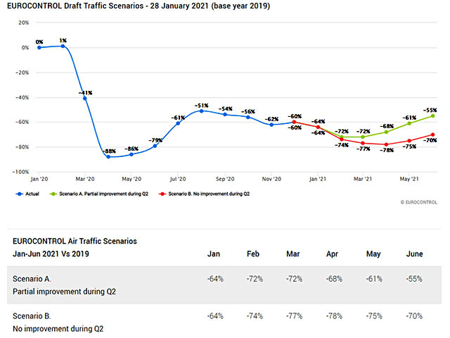 Le trafic des mois de février et mars 2021 sera « exceptionnellement bas » (entre -72% et -77% par rapport à 2019 selon les scénarios d’amélioration au deuxième trimestre) sur l’ensemble du réseau, « à l’exception du fret, de certains trafics commerciaux et de programmes squelettiques », explique le directeur général d’Eurocontrol Eamonn Brennan. Même le mois d’avril « devrait être très mauvais avec seulement une reprise limitée pour la période de Pâques » (entre -68% et -78%).