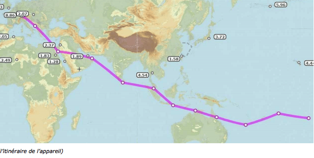 L’appareil de la ZIMEX a quitté l’aéroport Saint-Gall-Altenrhein, situé en Suisse sur les rives du lac de Constance, pour parcourir plus de la moitié du globe (+ de 23 000 km), jusqu’à Tahiti. Pour de rejoindre la Polynésie française, l’appareil aura fait 11 escales en se posant successivement à : Dubrovnik en Croatie ; Charm el-Cheikh en Egypte ; Mascate au sultanat d’Oman ; Colombo au Sri Lanka ; Kuala Lumpur en Malaisie ; Brunei ; Darwin et Cairns en Australie ; Nadi aux îles Fiji et enfin Niue. Il est arrivé à Tahiti le 02 février dans la nuit.
