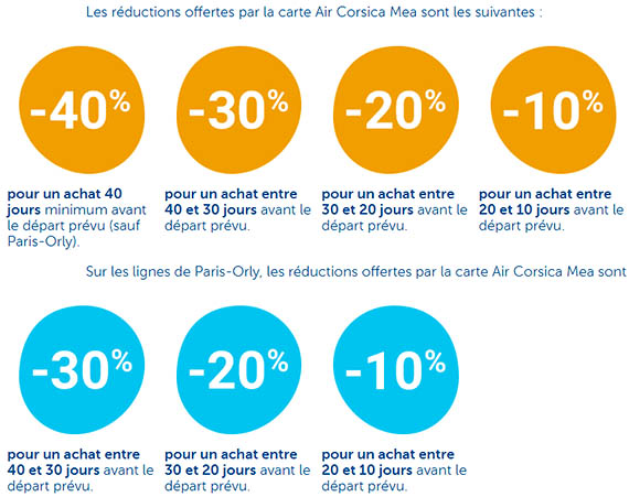 Vendue au tarif de 250€ et seulement 50€ pour les mineurs, la carte Air Corsica Mea permettra de bénéficier d’un tarif préférentiel avec « des prix réduits de -10% à -40% (-30 % maximum sur Paris-Orly) sur le tarif standard hors taxes », et ce en fonction de la date d’achat de votre billet d’avion : plus vous achetez votre billet à l’avance, plus le tarif proposé sera réduit. Ces réductions s’appliquent sur le tarif standard hors taxes et sont valables hors tarifs promotionnels, tarifs d’appel et aller simple, pour un séjour de 3 jours minimum sur place. Les billets achetés à ces tarifs sont non remboursables et modifiables, avec une pénalité de 70€ et d’éventuels frais de réajustement tarifaire. La franchise bagages incluse est d’un bagage en cabine et d’un bagage en soute.