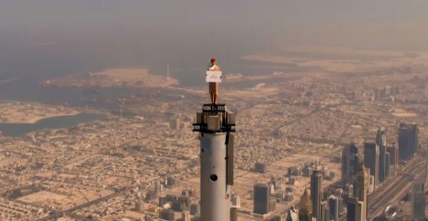 Emirates frappe haut dans sa dernière publicité : la compagnie émiratie a posé une hôtesse au sommet de la Burj Khalifa Tower de Dubaï, actuellement la tour la plus haute au monde culminant 828 mètres.