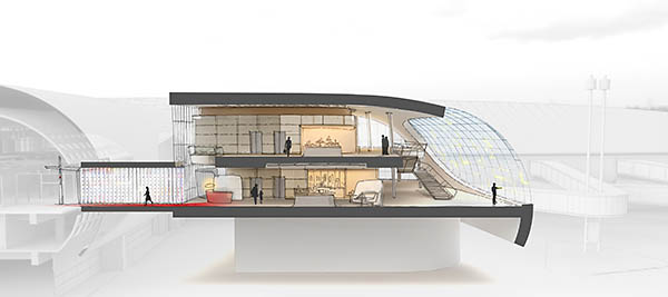 Les clients « découvrent ensuite une sculpture monumentale faisant le lien entre l’espace d’accueil et le salon. Cette œuvre inspirée des ailes d’un avion symbolise la légèreté, la technologie et l’avant-garde. Elle vient renforcer l’esprit « cocon » qui habite le salon. En profondeur, un « œil de piste » magistral se dévoile. Véritable fenêtre ouverte sur le ciel et le tarmac de l’aéroport, il traverse tout l’espace et accueille une belle lumière du nord venant illuminer le salon, sans jamais éblouir. Au lever du jour et à la tombée de la nuit, l’œil de piste scintille subtilement, insufflant chaleur et réconfort ».